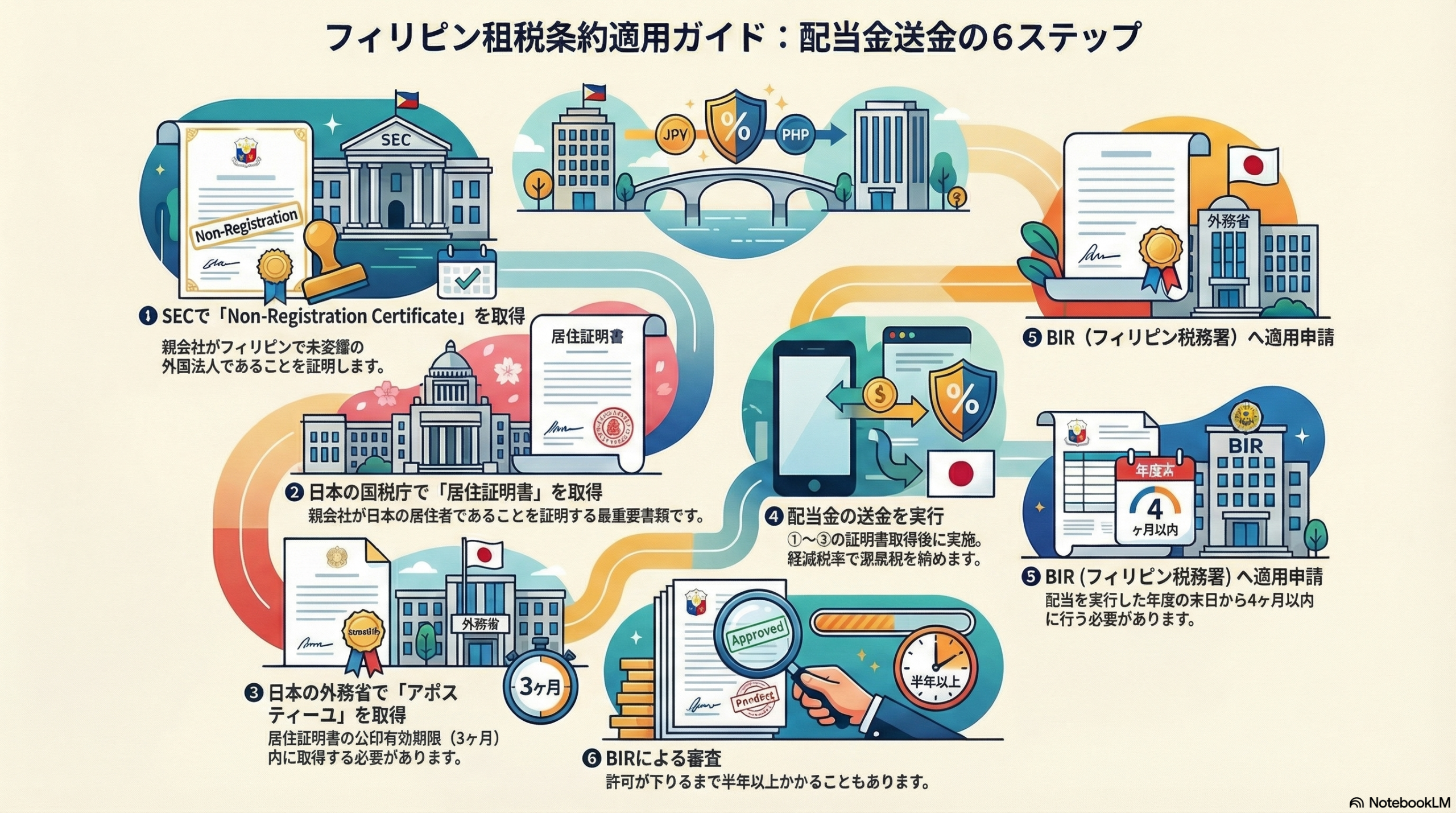 配当実行後、年度末から4ヶ月以内に、BIR(税務署)へ租税条約適用申請を行います。