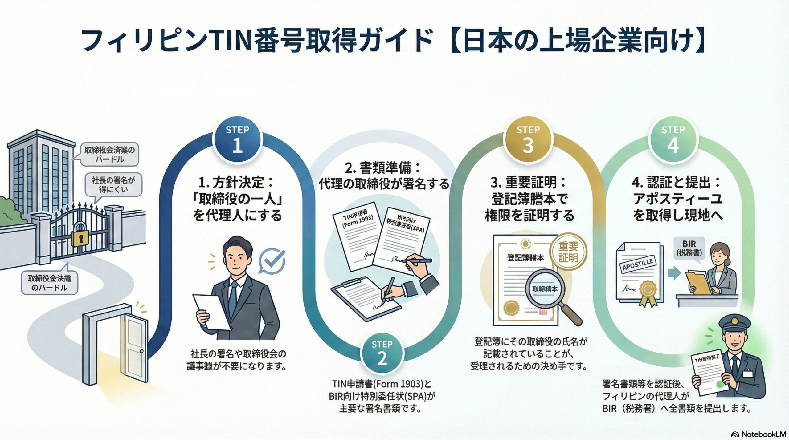 上場企業では取締役会開催頻度が低く、議題も多いため、「フィリピンでTIN取得のための決議書を作成する」というのは現場レベルでは非常にハードルが高いのが実情です。