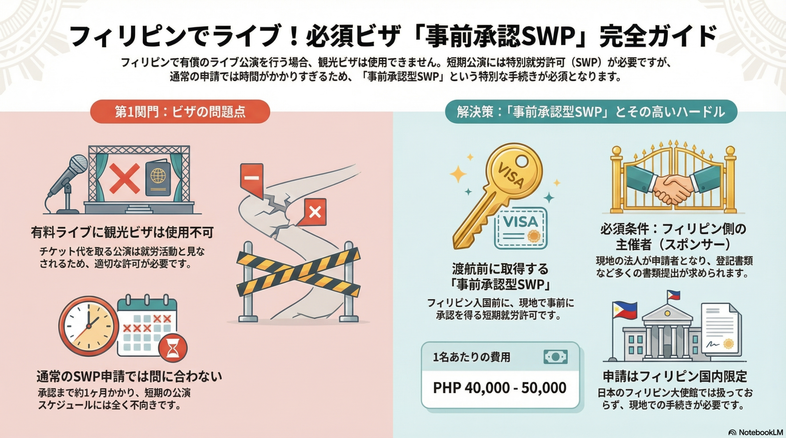 フィリピンでは、短期の興行・ライブ活動を行う外国人は、SWP(Special Work Permit) を取得する必要があります。